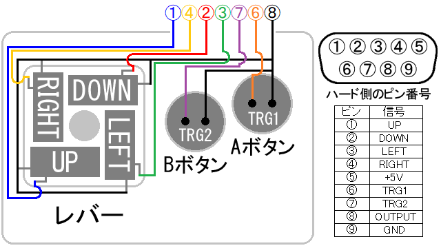 ボックスにレバー/ボタンを付けて、この画像の通りにRS-232ケーブルと接続して完成。
